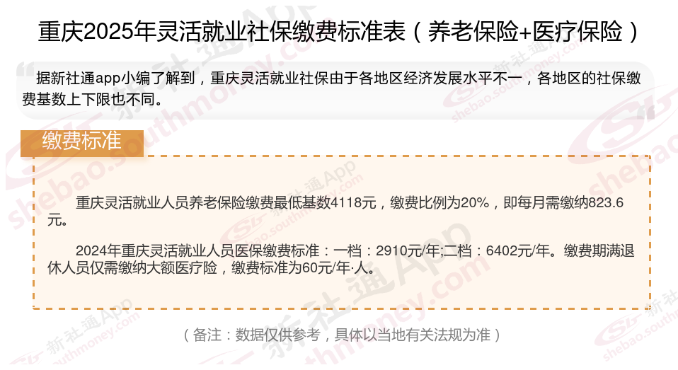 重庆灵活就业人员养老保险缴费最低基数4118元,缴费比例为20%,即每月需缴纳823.6元。