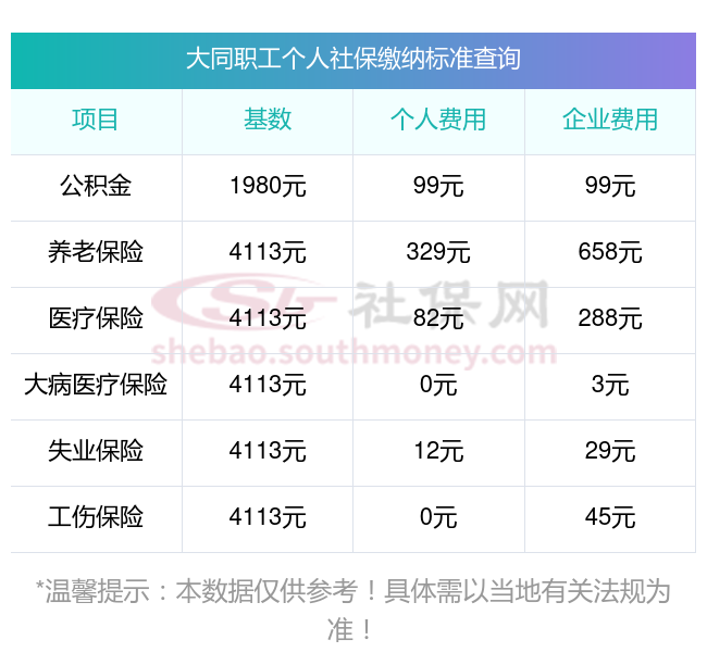 大同2025年社保养老保险缴费标准是多少?下表是2025年大同社保费用明细参考,新社通app-社保缴费查询工具提供的最新数据如下: