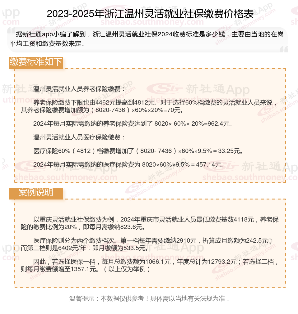 据新社通app数据显示,浙江温州灵活就业养老保险缴费基数2024-2025年最新标准如下: