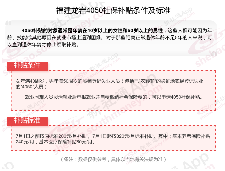 今天聊一下4050补贴话题。4050补贴听起来像是一个针对特定年龄人群的社保补贴。比如女性需年满40周岁,男性需年满50周岁(以申请当年12月31日为截止日期)。那么福建龙岩4050灵活就业社保补贴标准是多少钱?福建龙岩4050社保补贴条件是什么?接下来随新社通APP小编了解一下最新资讯。