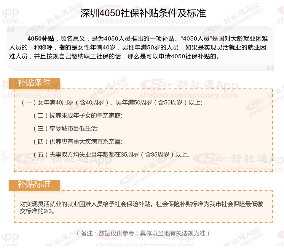 4050社保补贴标准据新社通app小编了解,通常,4050社保补贴包含基本医疗保险和基本养老保险两个险种,社保补贴金额为申请人实际缴纳基本养老保险和基本医疗保险金额的2/3,具体标准以当地社保局公布的数据为准!那么深圳灵活就业人员4050补贴最新标准是多少,深圳4050灵活就业人员社保补贴一年可以有多少钱?接下来随新社通APP小编具体了解一下4050社保补贴内容。
