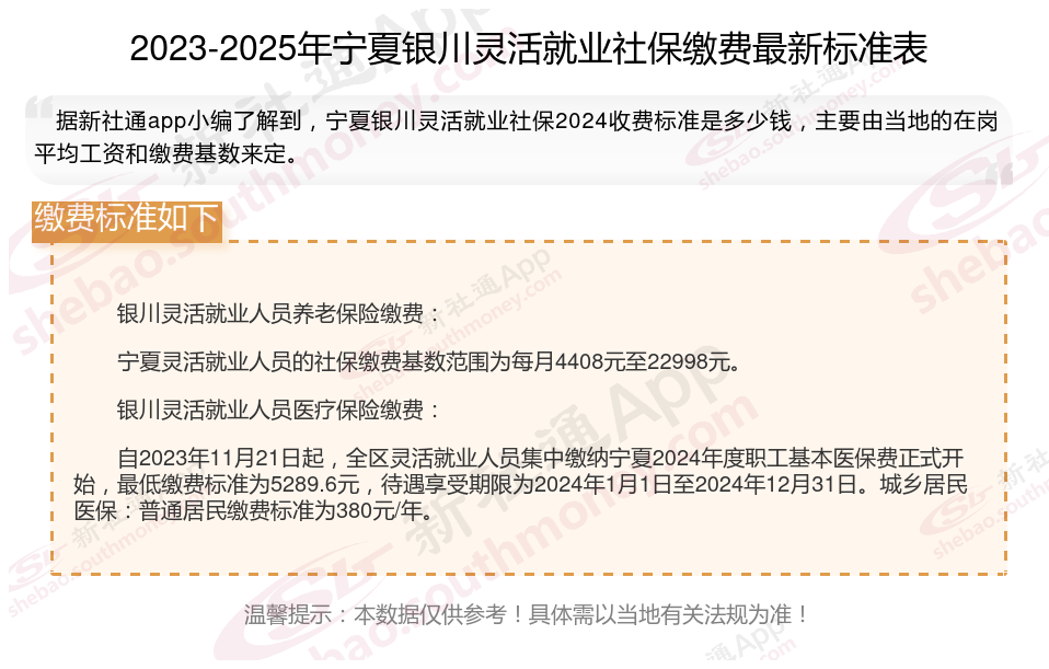 那么,宁夏银川灵活就业人员社保一个月多少钱?根据新社通app-社保缴费查询工具提供的2025社保缴费标准详情数据: