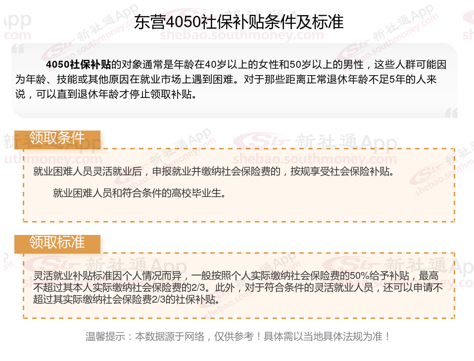 二、2025年东营4050社保补贴标准是多少?条件是什么?