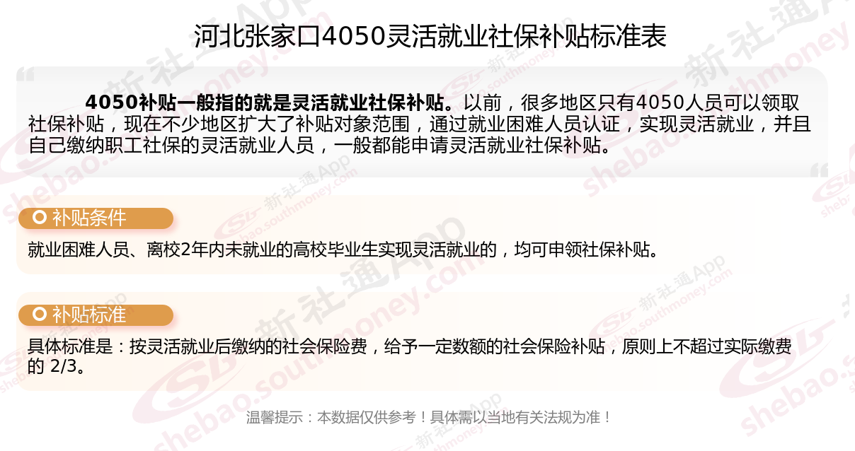 以上就是河北张家口4050灵活就业社保补贴的相关内容,欢迎关注新社通/下载新社通APP了解更多五险一金专业资讯。