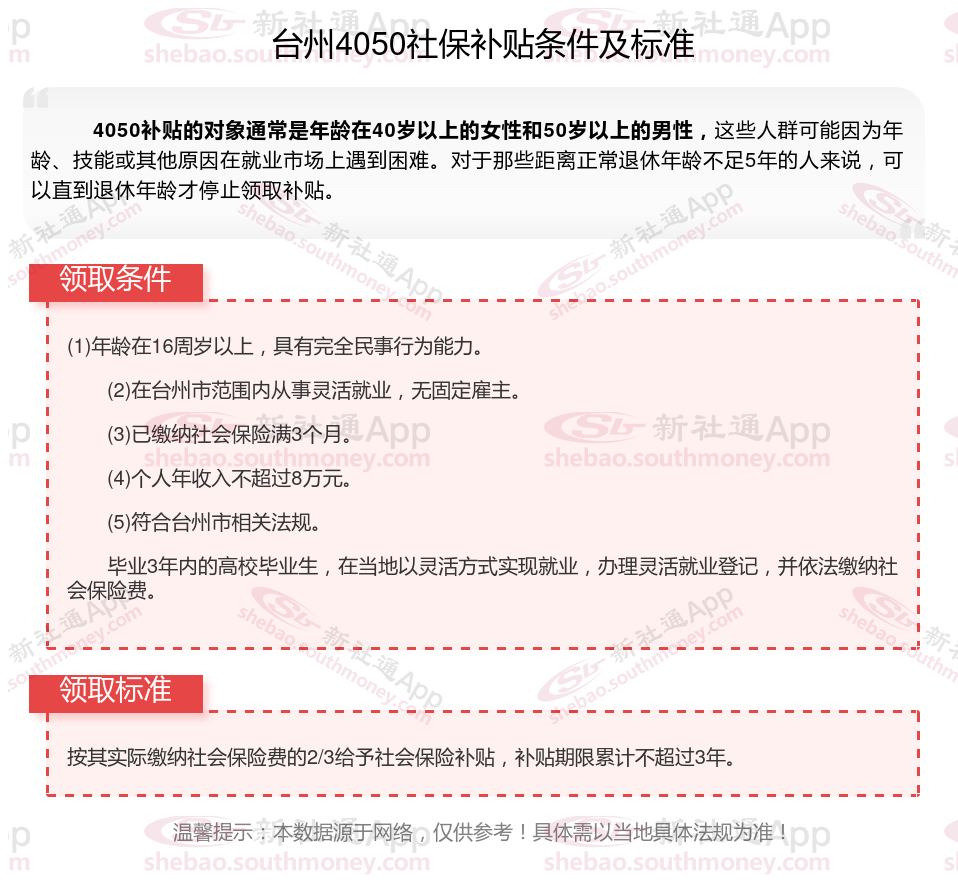 一、2025年台州灵活就业4050社保补贴标准及条件是什么