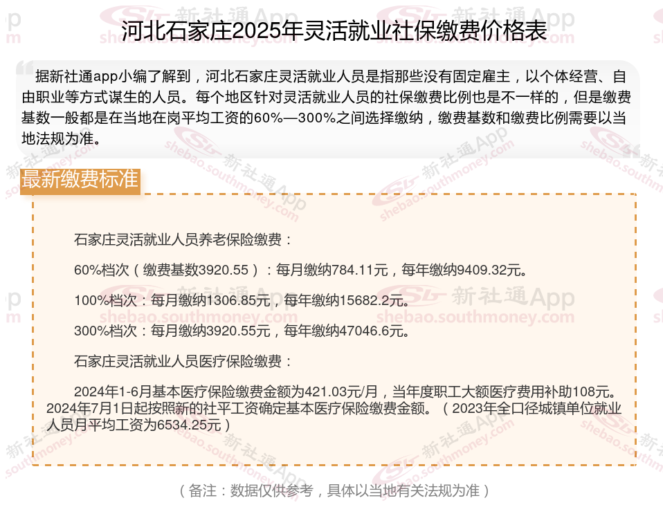据新社通app数据显示,2024-2025年河北石家庄灵活就业人员养老保险的缴费标准: