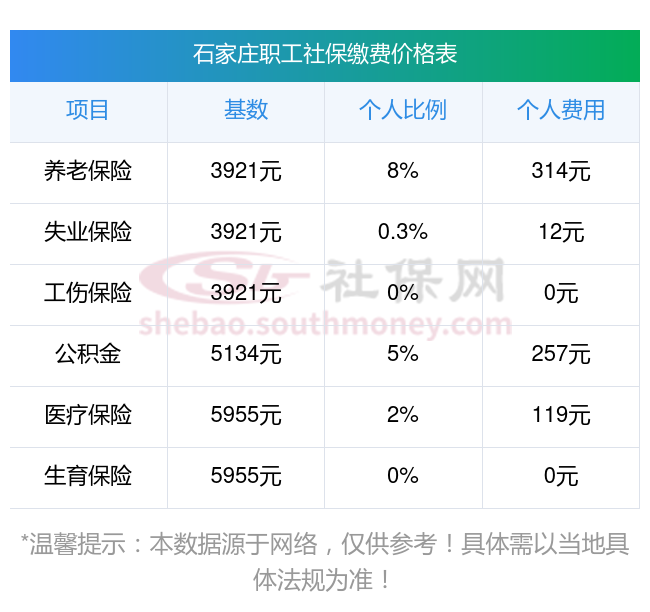 2025年石家庄社保缴费多少钱?下表是2024-2025年石家庄社保费用明细参考,新社通app-社保缴费查询工具提供的最新数据如下: