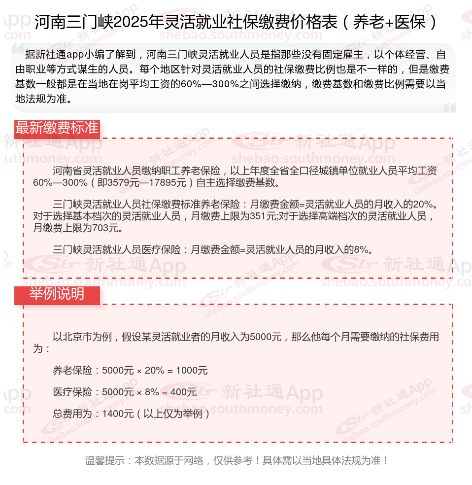 据新社通app数据显示,2024-2025年河南三门峡灵活就业人员养老保险的缴费标准是根据缴费基数来确定的: