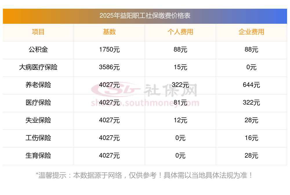 益阳2025年养老保险缴费标准是多少?下表是2025年益阳社保费用明细参考,新社通app-社保缴费查询工具提供的最新数据如下: