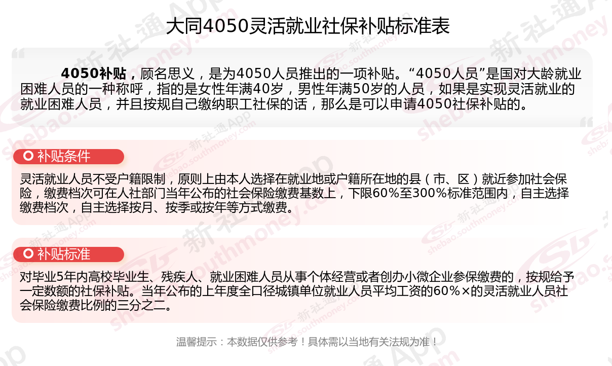 以上就是大同4050灵活就业社保补贴的相关内容,欢迎关注新社通/下载新社通APP了解更多五险一金专业资讯。