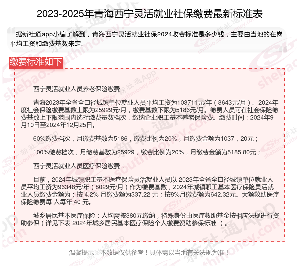 据新社通app数据显示,2024-2025年青海西宁灵活就业人员养老保险的缴费标准: