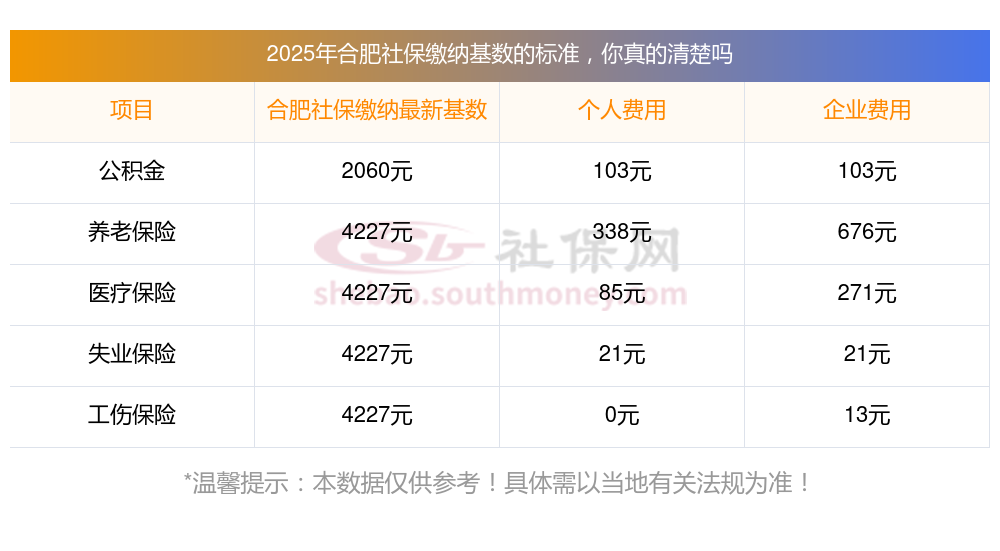 2025年合肥5险缴费标准是多少,2025年合肥社保缴费多少钱?下表是2025年合肥社保费用明细参考,新社通app-社保缴费查询工具提供的最新数据如下: