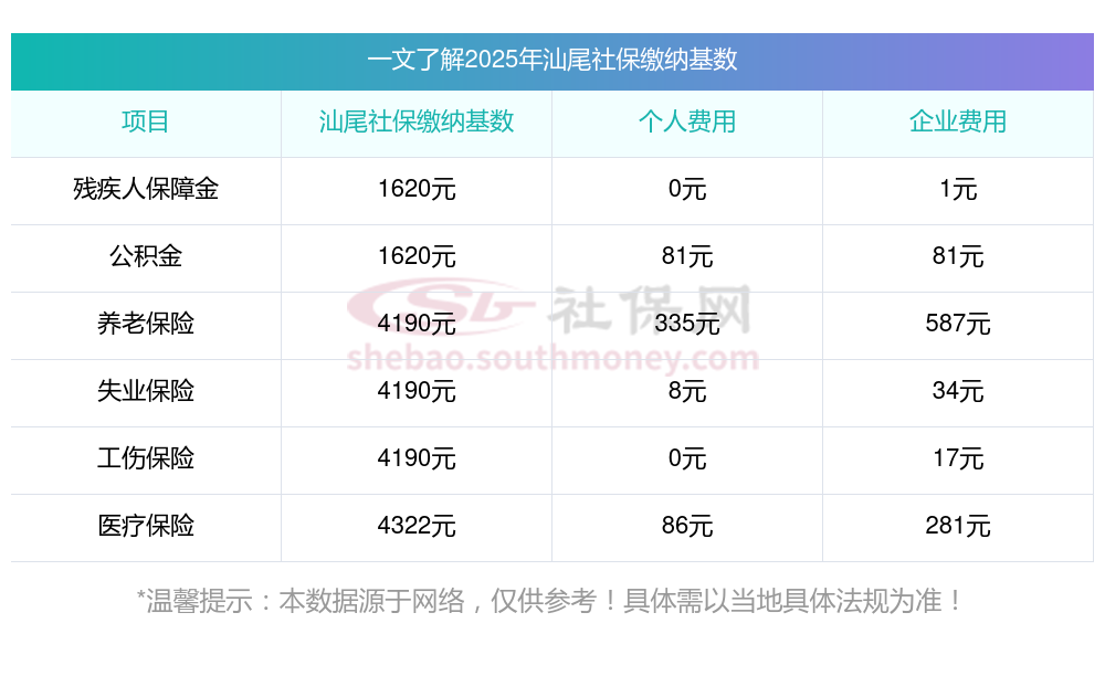 根据新社通app-社保缴费查询工具提供的最新数据,汕尾地区2025年的社保缴费标准已经确定。以下是各项保险的缴费比例及相应金额(基于一定的缴费基数)的详细说明:
