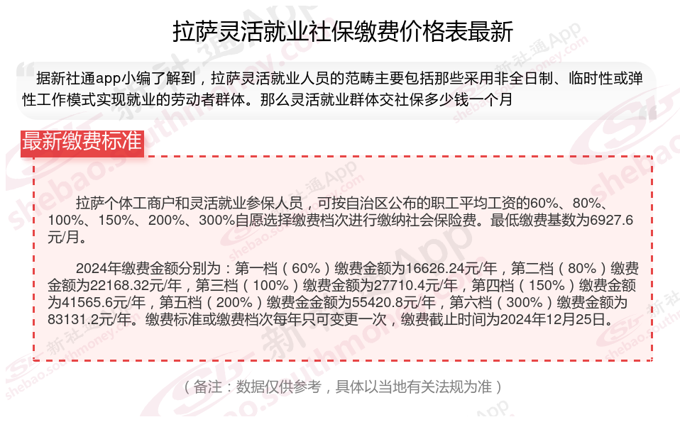 那么,拉萨灵活就业人员社保交多少钱?买根据新社通app-社保缴费查询工具提供的2025社保缴费标准详情数据: