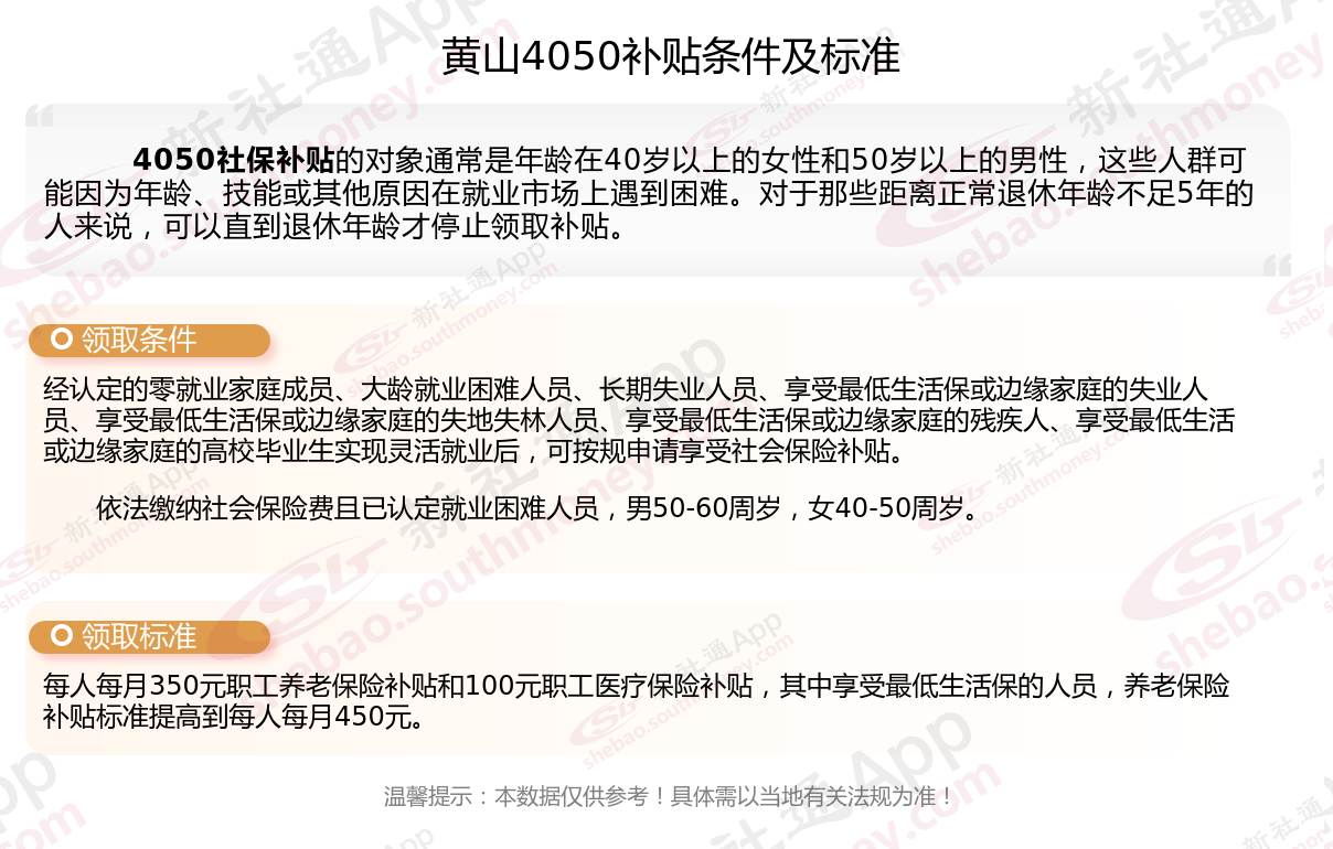 一、2023-2024年黄山4050社保补贴标准及条件,最新如下