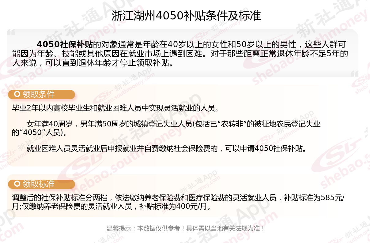 二、2025年浙江湖州4050社保补贴标准及条件,最新如下: