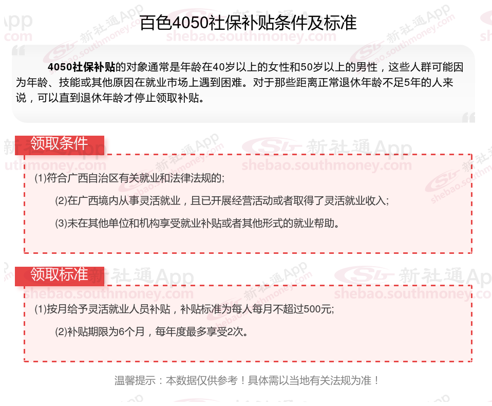 “灵活就业4050社保补贴”需要以灵活就业身份参加职工养老和医疗保险,补贴标准不超过实际缴费的三分之二,最长3年,距离退休不足5年的可延长到退休。补贴对象包括国企下岗人员、低保家庭等。申请流程需要提交身份证、银行账户等。那么百色4050灵活就业困难人员社保补贴标准是多少?百色4050社保补贴需要符合什么条件?接下来随新社通APP小编具体了解一下4050社保补贴内容。