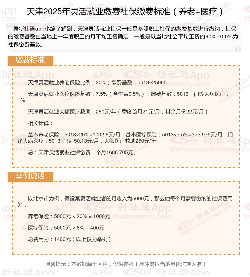 据新社通app数据显示,天津灵活就业养老保险缴费基数2024-2025年最新标准如下: