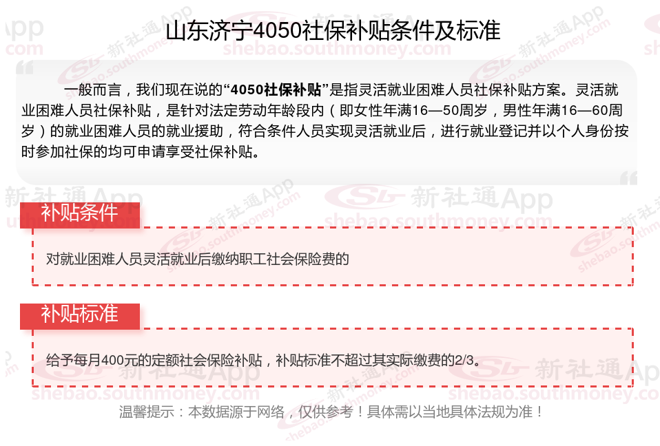 今天聊一下4050补贴的相关内容。4050补贴听起来像是一个针对特定年龄人群的社保补贴。比如女性需年满40周岁,男性需年满50周岁(以申请当年12月31日为截止日期)。那么山东济宁4050灵活就业困难人员社保补贴多少钱?山东济宁4050社保补贴可以申请吗?接下来随新社通APP小编具体了解一下4050社保补贴内容。
