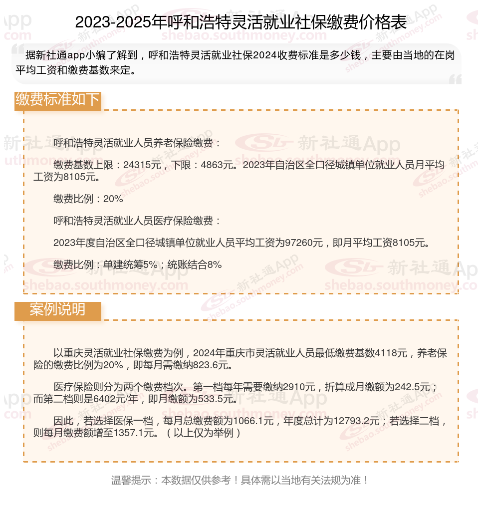 据新社通app数据显示,呼和浩特灵活就业养老保险缴费基数2024-2025年最新标准如下: