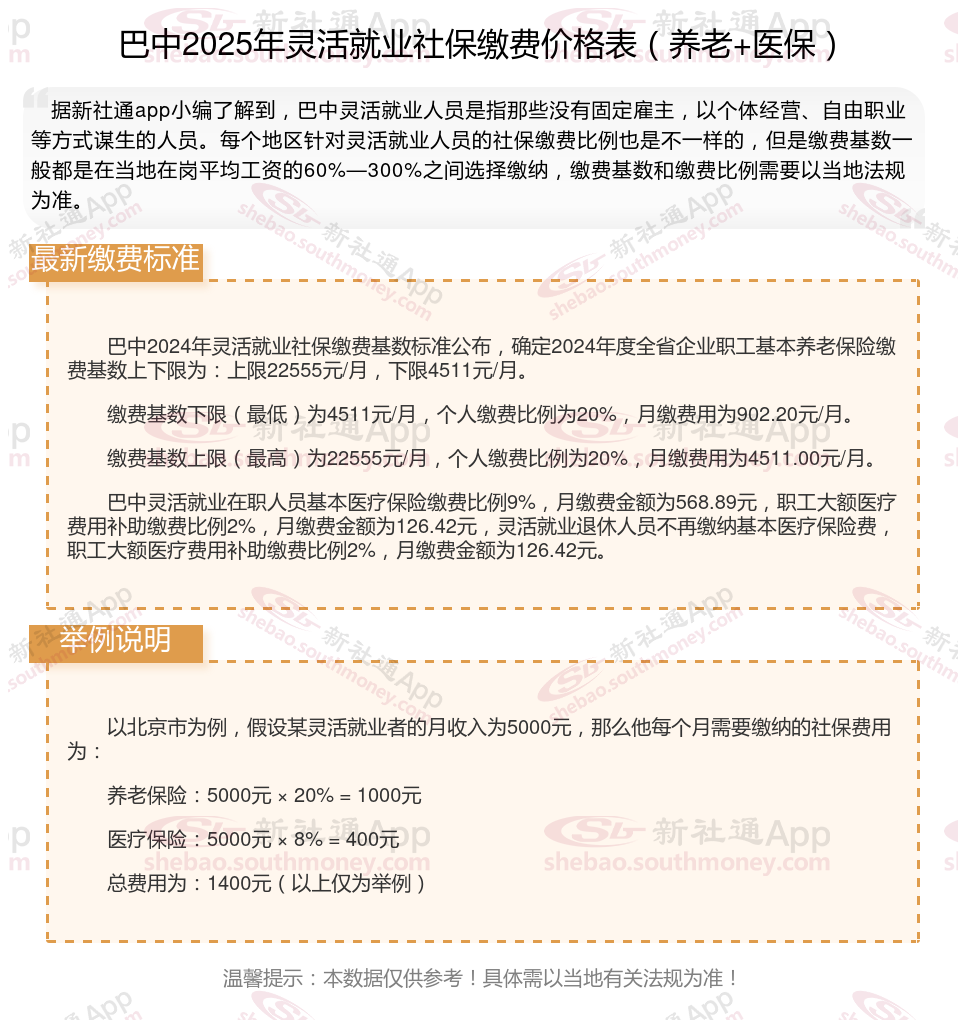 据新社通app数据显示,2024-2025年巴中灵活就业人员养老保险的缴费标准是根据缴费基数来确定的: