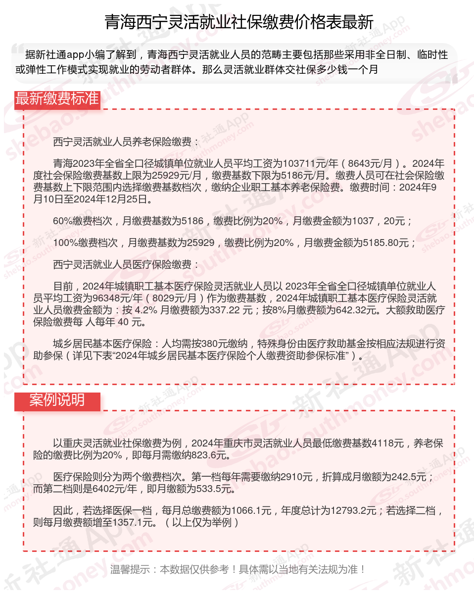 据新社通app数据显示,青海西宁灵活就业养老保险缴费基数2024-2025年最新标准如下: