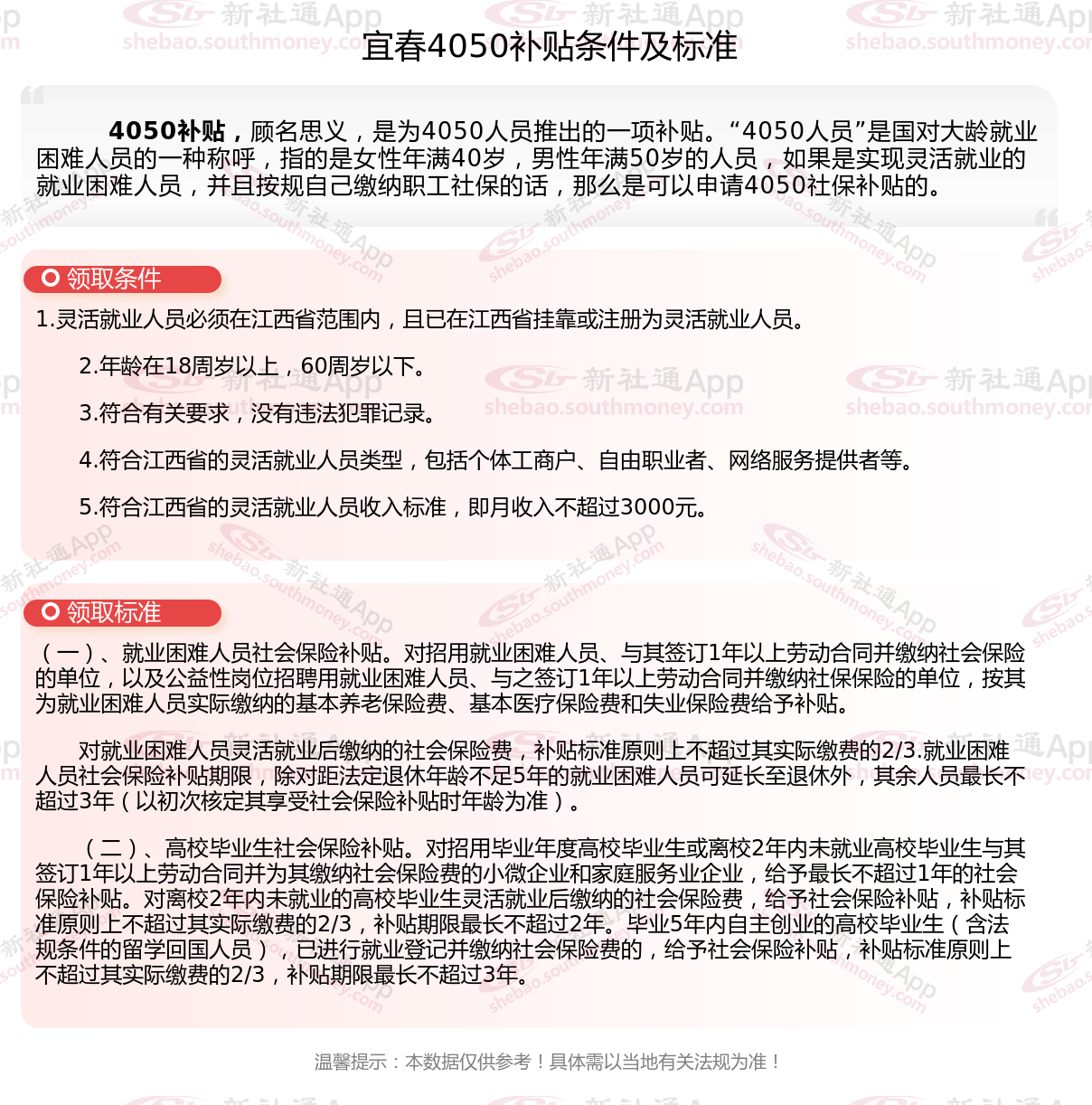 二、2025年宜春4050社保补贴标准及条件,最新如下: