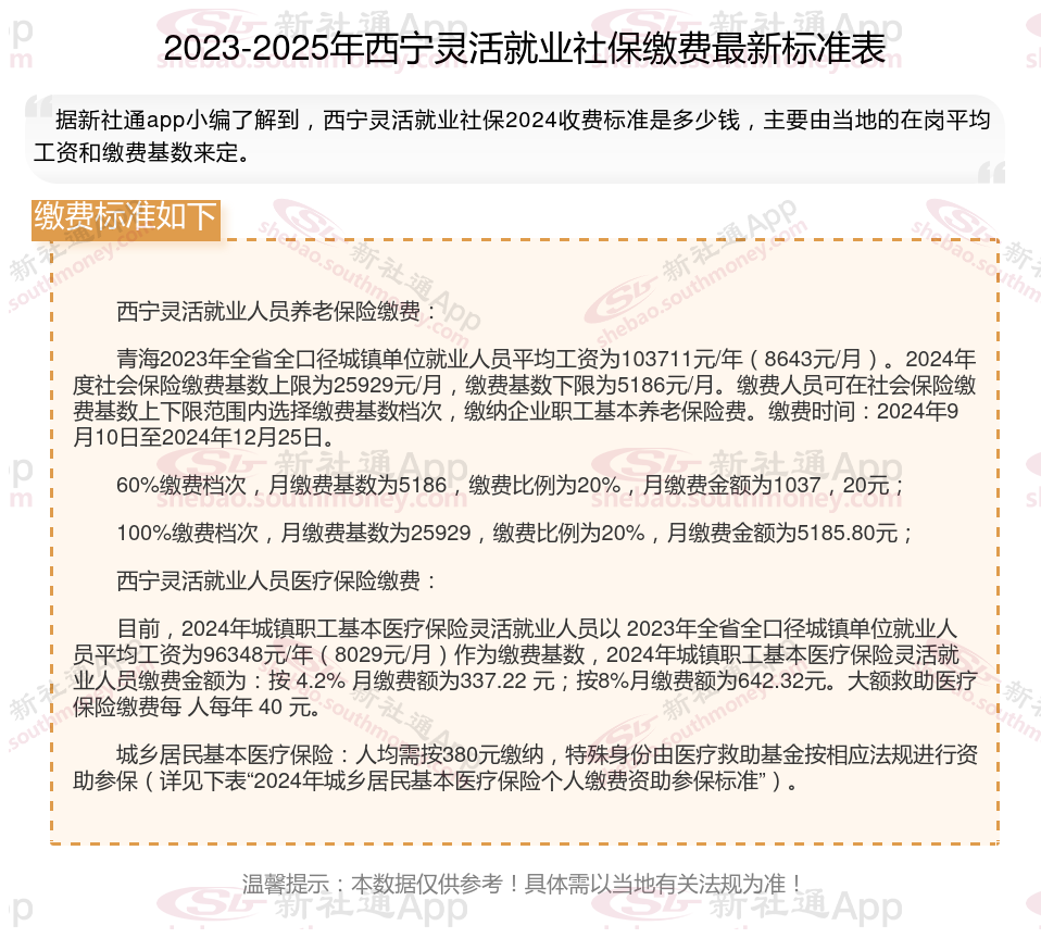 那么,西宁灵活就业人员社保交多少钱?买根据新社通app-社保缴费查询工具提供的2025社保缴费标准详情数据: