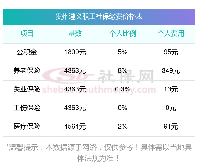 2025年贵州遵义社保缴费多少钱?下表是2024-2025年贵州遵义社保费用明细参考,新社通app-社保缴费查询工具提供的最新数据如下: