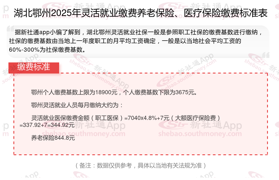 接下来了解一下,湖北鄂州灵活就业人员社保缴费标准是多少?退休能领多少钱呢?根据新社通app-社保缴费查询工具提供的2025社保缴费标准详情数据: