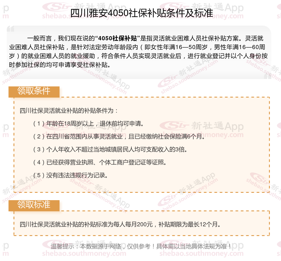 二、2025年四川雅安4050社保补贴标准及条件,最新如下: