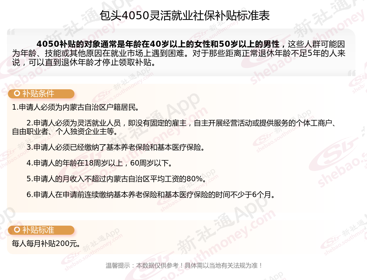 三、包头灵活就业4050社保补贴标准及条件是什么