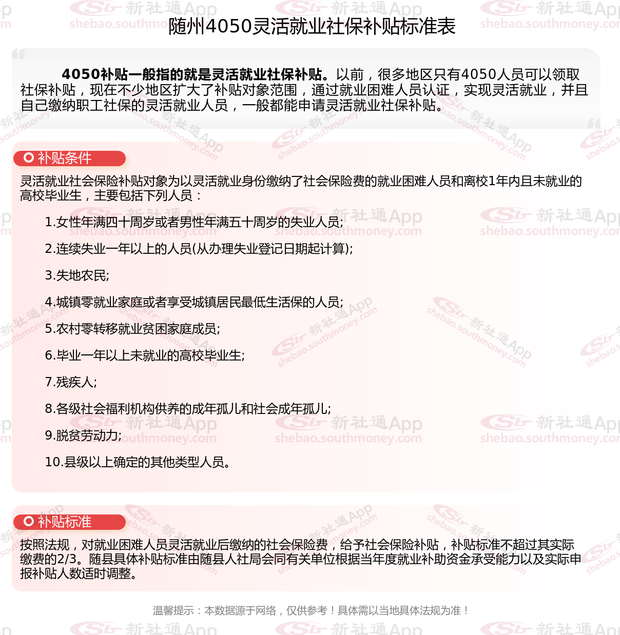 二、2025年随州4050社保补贴标准及条件,最新如下: