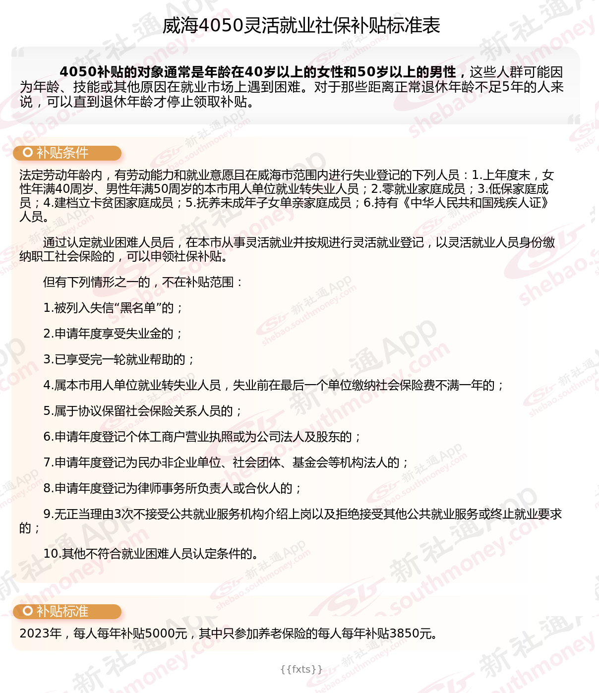 4050补贴主要是针对大龄就业困难人群的社保补贴,申请条件包括年龄、就业困难、灵活就业并自费缴纳社保,需要持有失业登记证,不同地区可能有细微差别,比如农村户口的限制。那么威海4050灵活就业社保补贴标准是多少钱?威海4050社保补贴条件是什么?接下来随新社通APP小编了解一下最新资讯。