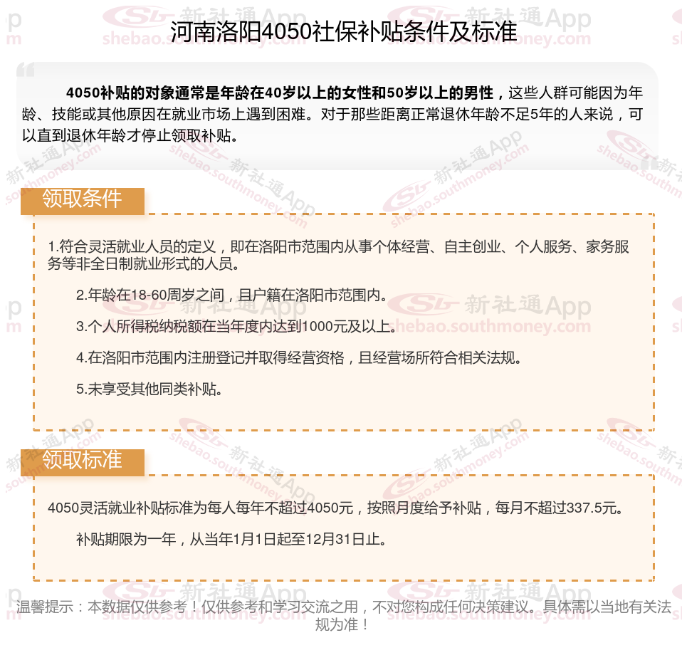 河南洛阳4050灵活就业社保补贴是什么?今天聊一下4050补贴话题。44050社保补贴标准据新社通app小编了解,通常,4050社保补贴包含基本医疗保险和基本养老保险两个险种,社保补贴金额为申请人实际缴纳基本养老保险和基本医疗保险金额的2/3,具体标准以当地社保局公布的数据为准!那么河南洛阳4050灵活就业社保补贴标准是多少钱?河南洛阳4050社保补贴可以领取多少?接下来随新社通APP小编了解一下河南洛阳4050灵活就业社保补贴的最新资讯。
