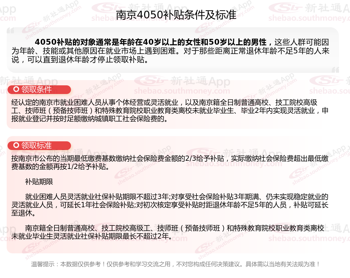 南京4050灵活就业社保补贴是什么?今天聊一下4050补贴话题。4050补贴听起来像是一个针对特定年龄人群的社保补贴。比如女性需年满40周岁,男性需年满50周岁(以申请当年12月31日为截止日期)。那么南京4050灵活就业社保补贴标准是多少钱?南京4050社保补贴可以领取多少?接下来随新社通APP小编了解一下南京4050灵活就业社保补贴的最新资讯。