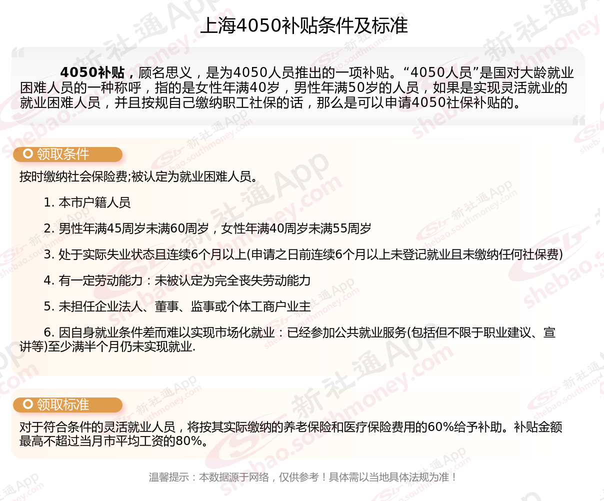 4050补贴需要以灵活就业身份参加职工养老和医疗保险,补贴标准不超过实际缴费的三分之二,最长3年,距离退休不足5年的可延长到退休。补贴对象包括国企下岗人员、低保家庭等。申请流程需要提交身份证、银行账户等。那么上海4050灵活就业社保补贴标准是多少钱?上海4050社保补贴条件是什么?接下来随新社通APP小编了解一下最新资讯。