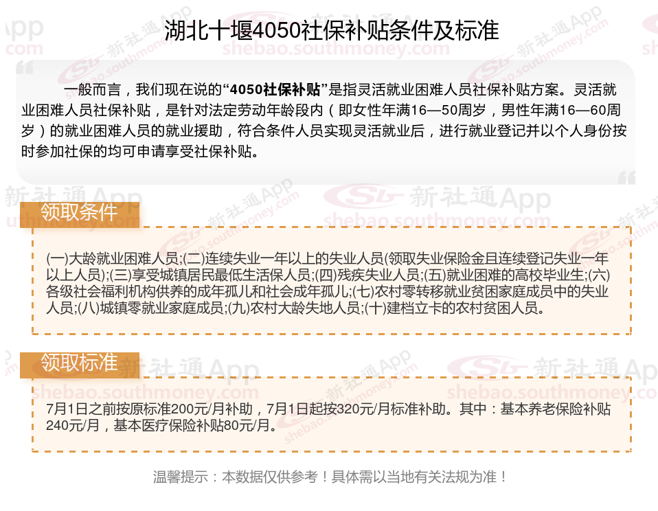 4050补贴主要是针对大龄就业困难人群的社保补贴,申请条件包括年龄、就业困难、灵活就业并自费缴纳社保,需要持有失业登记证,不同地区可能有细微差别,比如农村户口的限制。那么湖北十堰4050灵活就业社保补贴标准是多少钱?湖北十堰4050社保补贴条件是什么?接下来随新社通APP小编了解一下最新资讯。