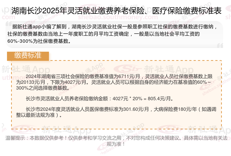 湖南长沙灵活就业人员的社保缴费标准是多少?根据新社通app-社保缴费查询工具提供的最新数据如下: