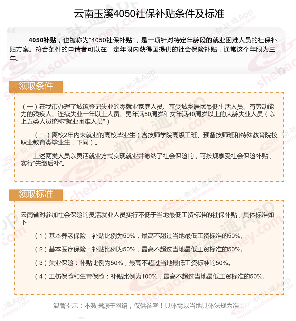 今天聊一下4050补贴的相关内容。4050补贴听起来像是一个针对特定年龄人群的社保补贴。比如女性需年满40周岁,男性需年满50周岁(以申请当年12月31日为截止日期)。那么云南玉溪4050灵活就业困难人员社保补贴多少钱?云南玉溪4050社保补贴可以申请吗?接下来随新社通APP小编具体了解一下4050社保补贴内容。