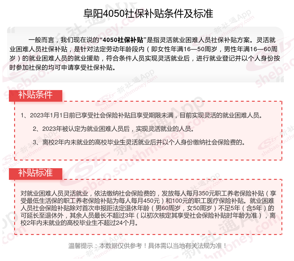 4050补贴主要是针对大龄就业困难人群的社保补贴,申请条件包括年龄、就业困难、灵活就业并自费缴纳社保,需要持有失业登记证,不同地区可能有细微差别,比如农村户口的限制。那么阜阳4050灵活就业社保补贴标准是多少钱?阜阳4050社保补贴条件是什么?接下来随新社通APP小编了解一下最新资讯。