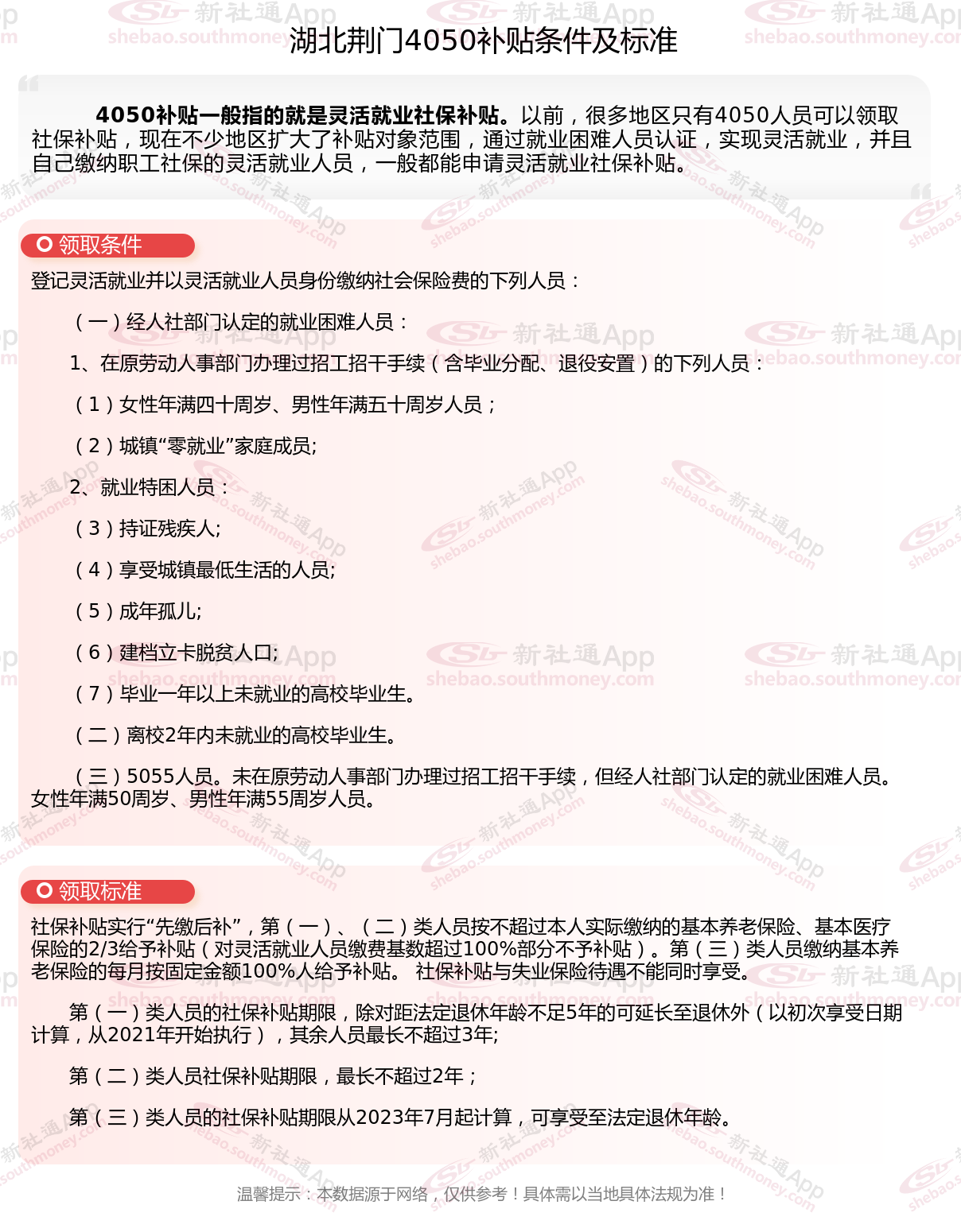 “灵活就业4050社保补贴”是指灵活就业困难人员社保补贴。该方案是对就业困难人员灵活就业后办理了就业登记手续并参加社会保险的,给予社会保险补贴。那么湖北荆门4050灵活就业困难人员社保补贴标准是多少?湖北荆门4050社保补贴需要符合什么条件?接下来随新社通APP小编了解一下最新资讯。