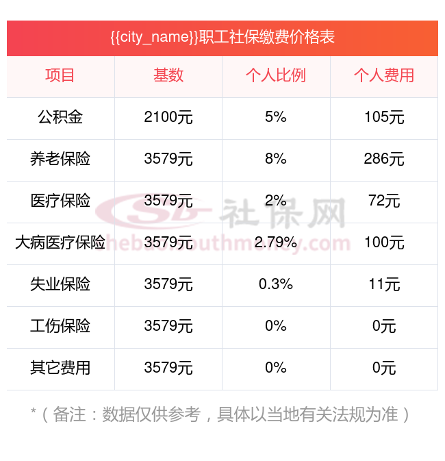 工伤保险:工伤保险费用由用人单位全额缴纳,职工个人无需缴纳。通常,单位的缴纳比例为1%。