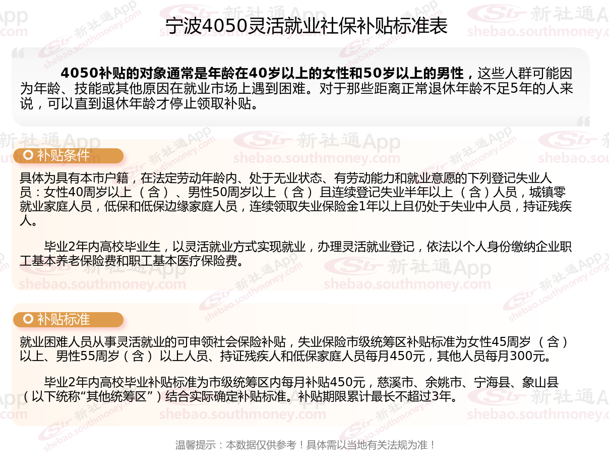 宁波4050灵活就业社保补贴是什么?今天聊一下4050补贴话题。44050社保补贴标准据新社通app小编了解,通常,4050社保补贴包含基本医疗保险和基本养老保险两个险种,社保补贴金额为申请人实际缴纳基本养老保险和基本医疗保险金额的2/3,具体标准以当地社保局公布的数据为准!那么宁波4050灵活就业社保补贴标准是多少钱?宁波4050社保补贴可以领取多少?接下来随新社通APP小编了解一下宁波4050灵活就业社保补贴的最新资讯。