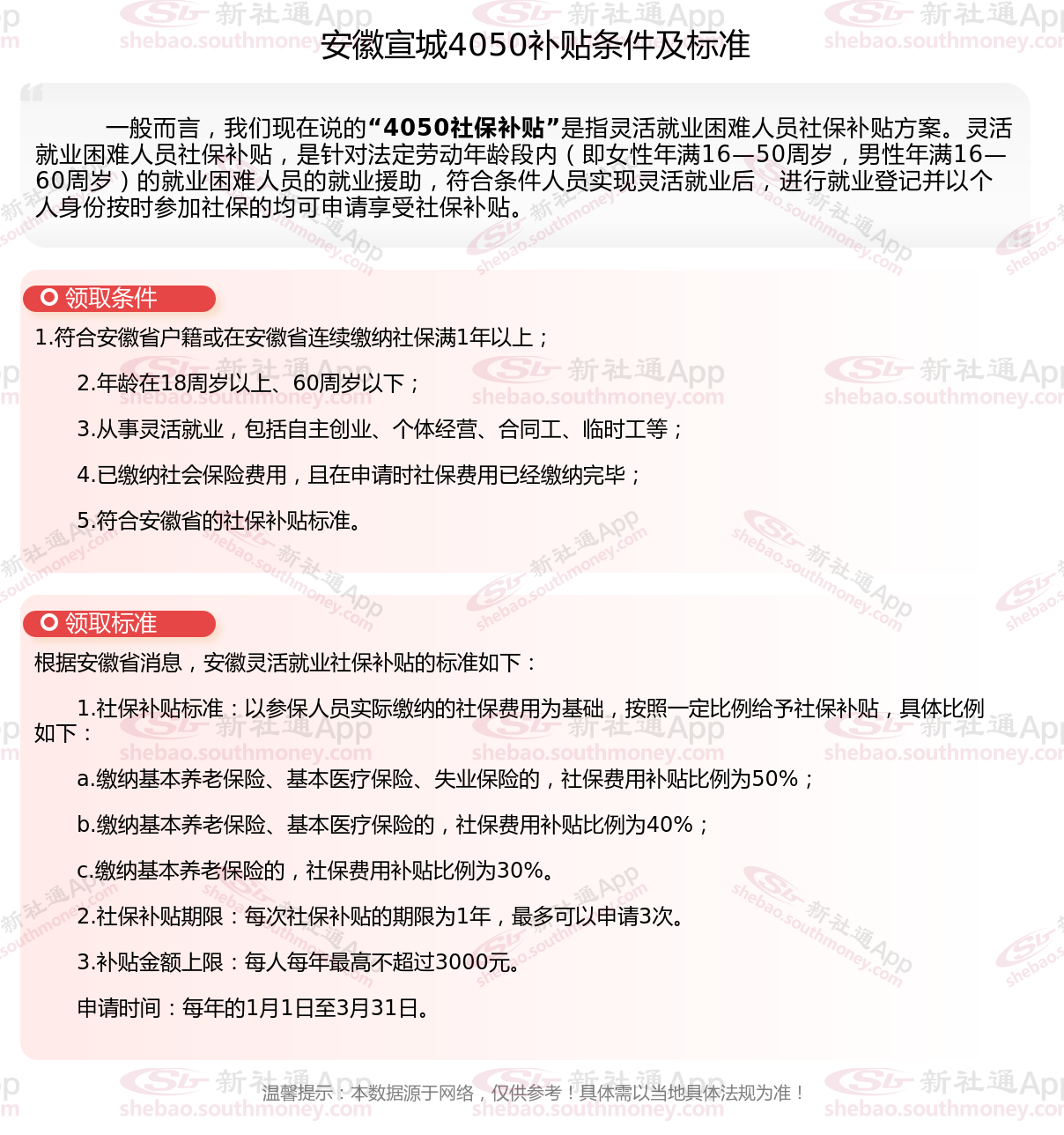 4050社保补贴标准据新社通app小编了解,通常,4050社保补贴包含基本医疗保险和基本养老保险两个险种,社保补贴金额为申请人实际缴纳基本养老保险和基本医疗保险金额的2/3,具体标准以当地社保局公布的数据为准!那么安徽宣城灵活就业人员4050补贴最新标准是多少,安徽宣城4050灵活就业人员社保补贴一年可以有多少钱?接下来随新社通APP小编具体了解一下4050社保补贴内容。