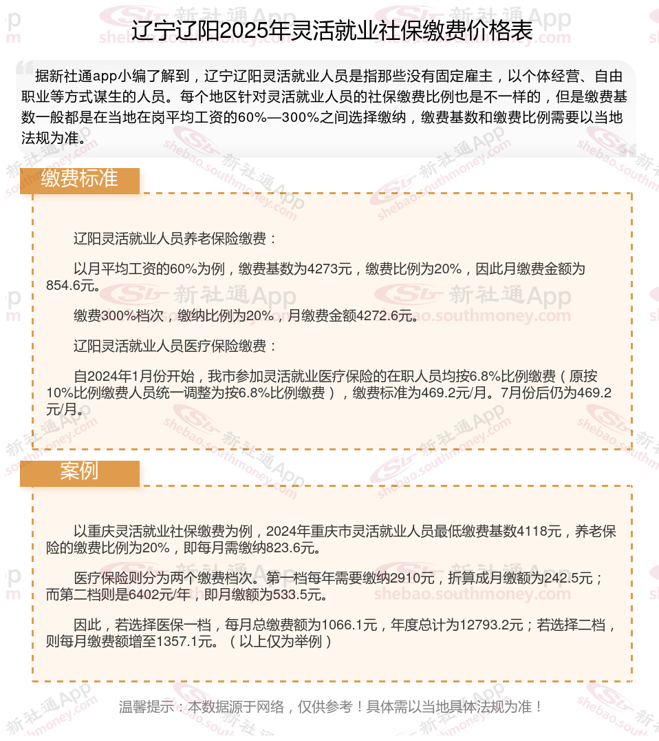辽宁辽阳灵活就业自己交社保一个月要交多少钱?根据新社通app-社保缴费查询工具提供的最新数据如下: