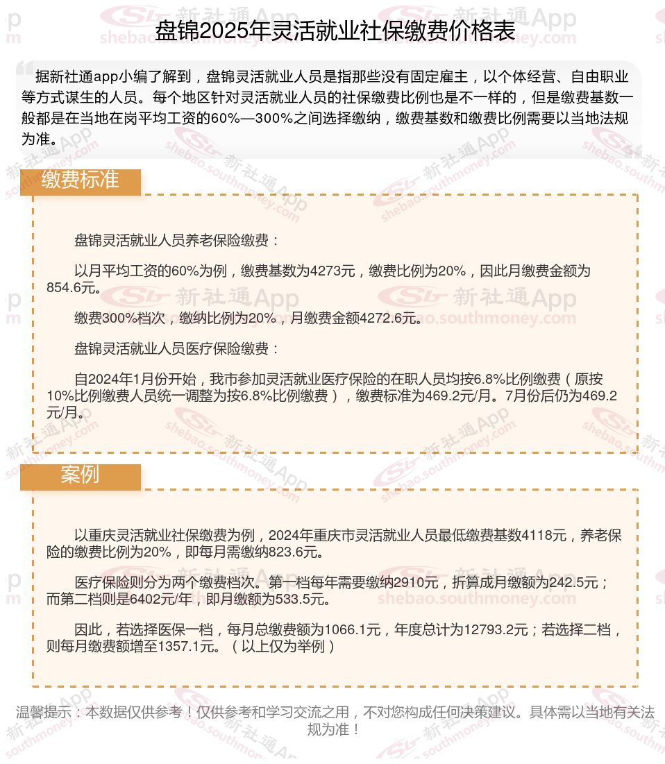 一、2025年盘锦灵活就业社保缴费标准表 盘锦灵活就业社保多少钱一个月?