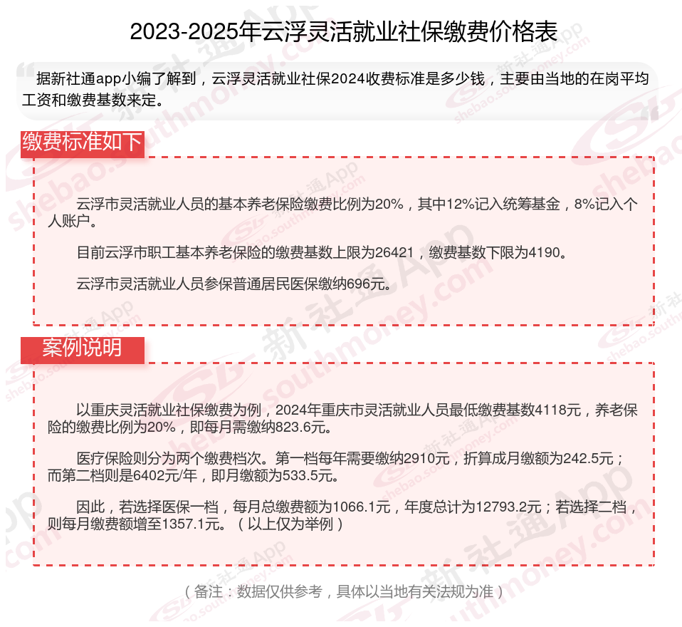 据新社通app数据显示,云浮灵活就业养老保险缴费基数2024-2025年最新标准如下: