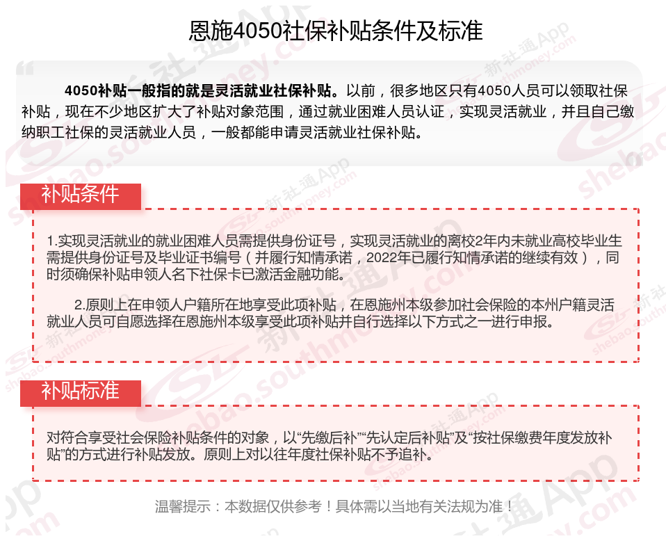 2025恩施灵活就业4050社保补贴是一项面向特定年龄段的就业困难人群的社会保险补贴。