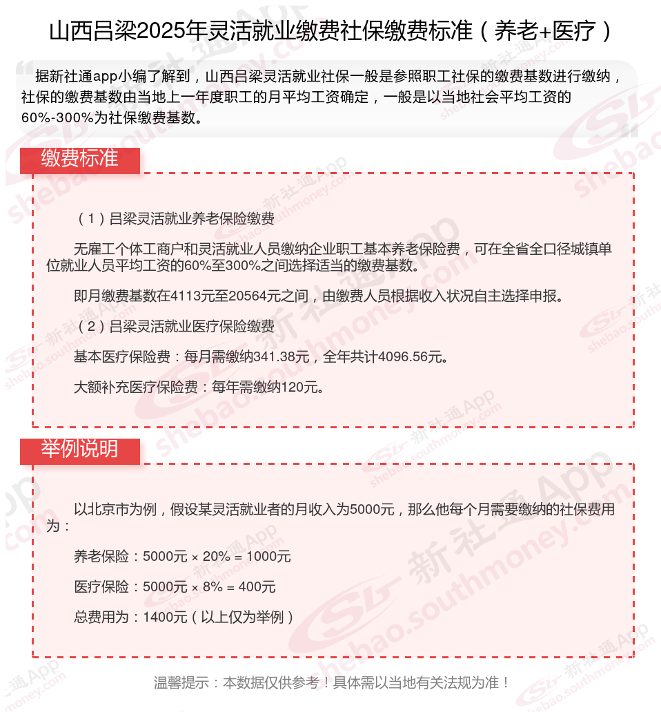 据新社通app数据显示,山西吕梁灵活就业养老保险缴费基数2024-2025年最新标准如下: